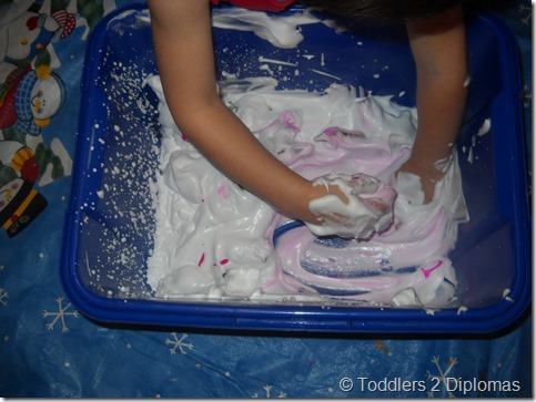 Then I brought in the shaving cream and the dinosaurs immediately went “swimming”.